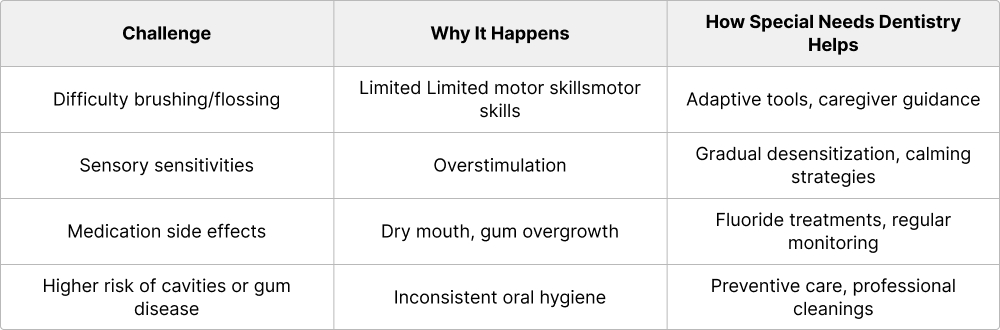 These children may struggle with oral hygiene due to limited dexterity, sensory sensitivities, or behavioral challenges. Medications, diet, and medical treatments can also affect oral health, making professional guidance essential.